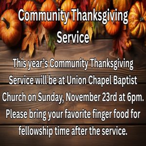 This year’s Community Thanksgiving Service will be at Union Chapel Baptist Church on Sunday, November 23rd at 6pm. The address is 901 E F St, Butner, NC 27509. Please bring your favorite finger food for fellowship time after the service.